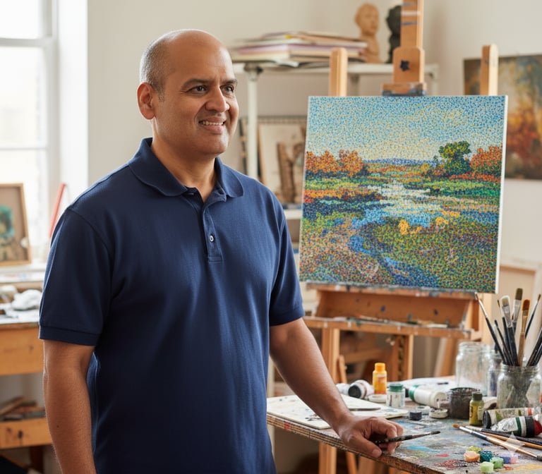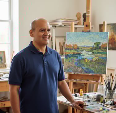 Rohit Kalbag's innovative artworks are not just to be seen; they are to be experienced. Inspired by techniques seen in movements like Pointillism, Rohit uses the concept of optical color mixing to create breathtaking effects. Utilizing computer assistance, he achieves an unparalleled level of precision in placing individual color elements, allowing him to create intricate patterns and designs that, when viewed up close, appear as complex abstract compositions. As you step back, these seemingly disparate elements coalesce, revealing stunning images, subtle gradients, and entirely new color palettes that were "hidden" in plain sight. Rohit's art is a testament to the power of perception, a playful dance between what is truly there and what your mind creates.